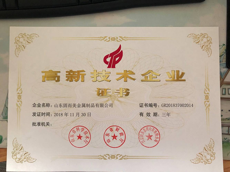 山東固而美金屬制品有限公司喜獲“國家高新技術(shù)企業(yè)”認(rèn)證證書,標(biāo)志著山東固而美正式邁入“國家級(jí)高企”序列。