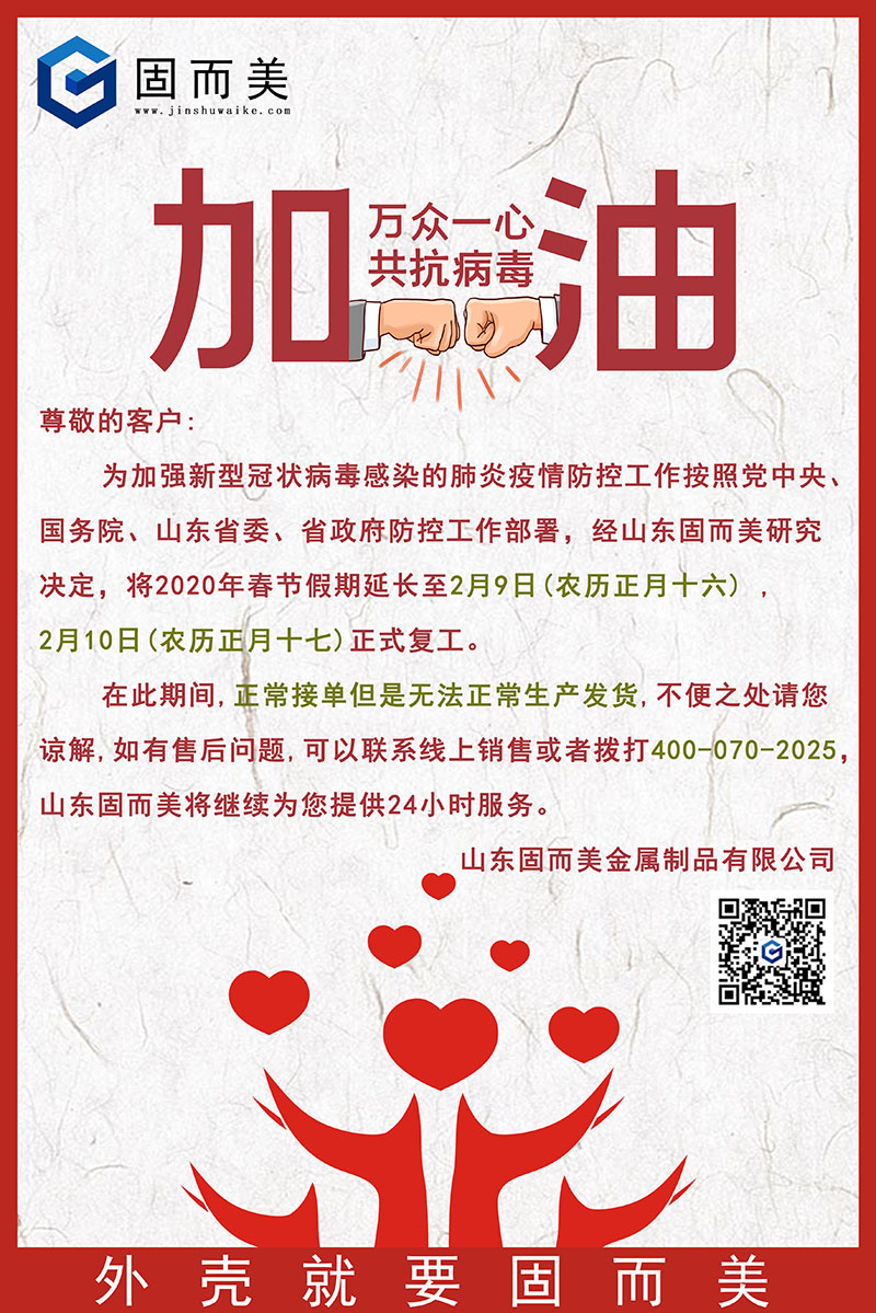 為加強新型冠狀病毒感染的肺炎疫情防控工作按照黨中央、國務院、山東省委、省政府防控工作部署,經山東固而美研究決定,將2020年春節假期延長至2月9日(農歷正月十六) , 2月10日(農歷正月十七)正式復工。
